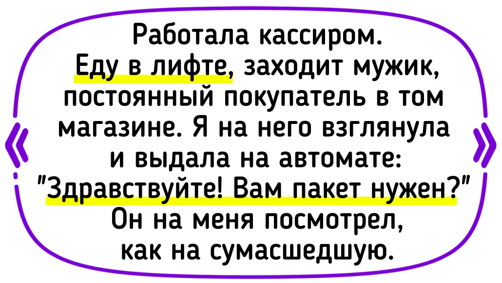 👉 Все эти истории из жизни рассказали читатели наших каналов на Дзене. Работала кассиром. Еду в лифте, заходит мужик, постоянный покупатель в том магазине. Я на него взглянула и выдала на автомате: "Здравствуйте! Вам пакет нужен?" Он на меня посмотрел, как на сумасшедшую. © Наталья Л. / Dzen Зимой 1990 года в Екатеринбурге зашёл в трамвай и отбиваю проездной. Компостер находился невысоко, между окнами, как раз над сидящим пассажиром. В то время все носили меховые шапки. Это мужика и спасло. Компостер был немного погнут от частых ударов, и я, как обычно, сильно ударяю по рычагу компостера и… рука срывается, и я бью товарища в шапке. Мне так неудобно стало, я извинился и отошёл подальше. Потом ещё забегают люди, и 2–3 ещё добавили этому мужику. А ему деваться некуда, свободных мест нет — вот он даже голову перестал поднимать. Просто наклонился вперёд, чтобы хоть по спине только лупили. Мне после увиденного полегче стало, что я не один такой растяпа. © Lemanya / Dzen Я на днях ехала в би