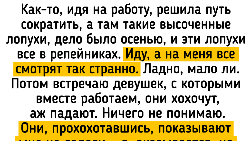 Как-то, идя на работу, решила путь сократить, а там такие высоченные лопухи, дело было осенью, и эти лопухи все в репейниках. Иду, а на меня все смотрят так странно. Ладно, мало ли. Потом встречаю девушек, с которыми вместе работаем, они хохочут, аж падают. Ничего не понимаю. Они, прохохотавшись, показывают мне на голову — я, оказывается, на шапку целый клубок репейников насобирала. © Марина Пестова / Dzen