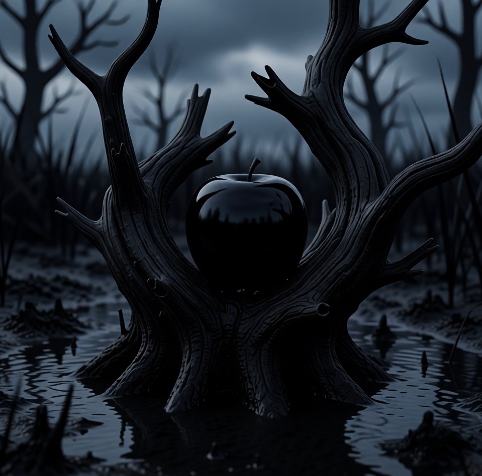 Хватают пальцы костлявые Мрака, и будто помогают быстрее до яблони добраться. А яблоня та корявая, гнилая. Плоды на ней тиной покрыты. И лишь на одной веточке, с краю, висит блестящее чёрное яблоко с серебряным бочком.