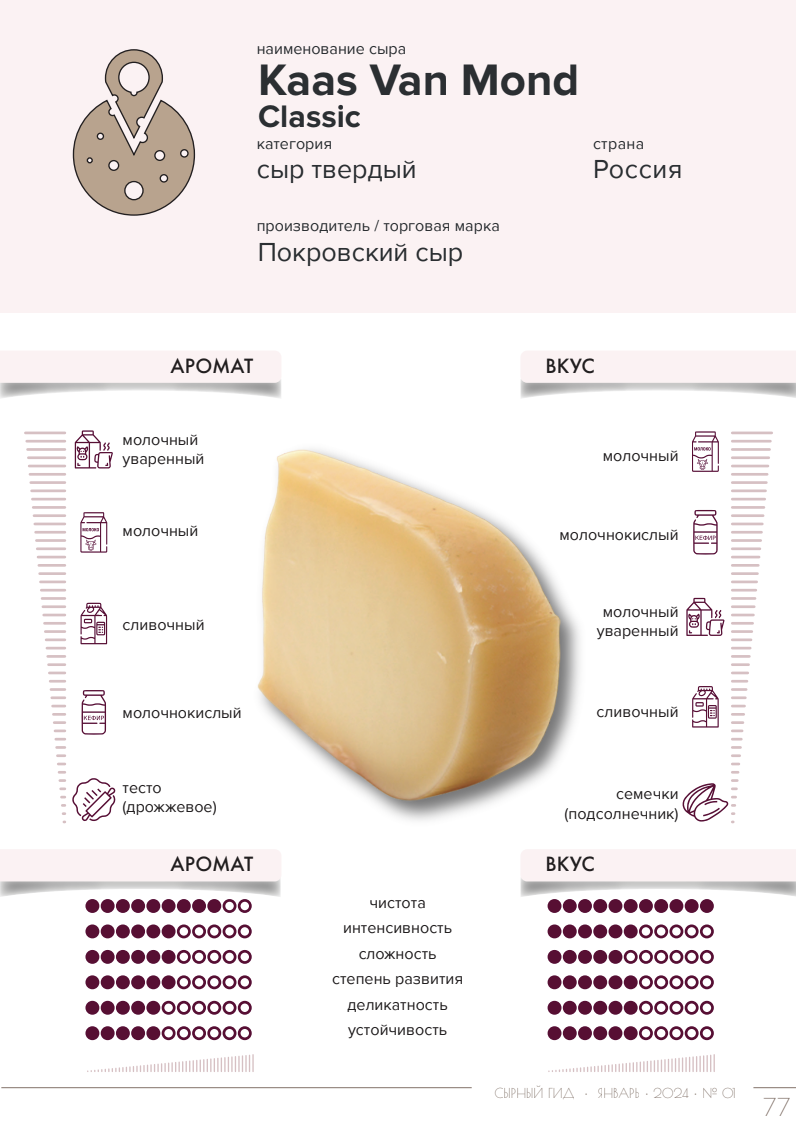 Не все сыры должны занимать первые места на конкурсах, возможно где-то есть сыр, который подойдет именно вам и займет место в вашем сердце. Продолжаем знакомство с сырами и их органолептическим профилем. Аромат сыра умеренной интенсивности и сложности. В аромате доминируют молочный уваренный, молочный и сливочный тона, дополняемые нюансами сметаны, пломбира, дрожжевого теста. Вкус сыра чистый, умеренной интенсивности. Во вкусе доминирую молочный, молочно-кислый и молочный уваренный тона. Нюансы вкуса – сливочный, семечки подсолнечника. Во вкусе сыр несладкий, с выраженной кислотностью, слабосоленый, слабожирный. Сыр хорошо дополнит своим профилем горячие блюда, брускетты. Аромат сыра чистый, умеренной интенсивности, простой, но усложнен внесенным пажитником. Доминанты аромата – пажитник, ореховый, кофе (айриш крим). Пажитник украшает базовую ароматику сыра, сыр хочется попробовать. Вкус сыра чистый, умеренной интенсивности, простоватый. Во вкусе доминирую тона: молочный, молочнокислый