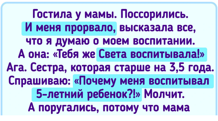 - Гостила у мамы. Сильно поссорились, и тут меня прорвало, высказала все, что я думаю о моем воспитании и об отношении ко мне в детстве. А она: «А что ты мне это предъявляешь? Тебя же с рождения Света воспитывала! Вот это она во всем и виновата». Ага. Сестра, которая старше на 3,5 года. И которая меня в связи с этим от всей души ненавидела. Спрашиваю: «Ты понимаешь, что ты говоришь? Почему меня воспитывал 5-летний ребенок?!» Молчит. А поругались, потому что мама решила, что сейчас самое время начать меня контролировать и воспитывать. В мои 35. © Unknown author