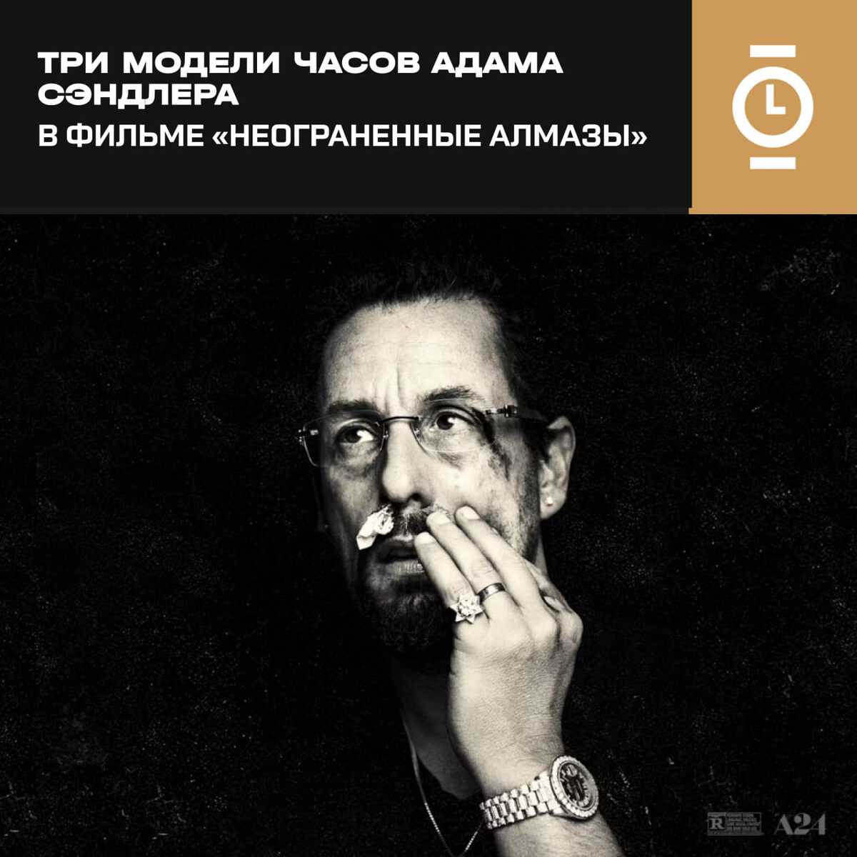 » #art_WD Если вы ищете доброе кино, то вам явно не сюда. Фильм «Неограненные алмазы» (2019) получил своё название в честь группы потрёпанных жизнью персонажей и буквально куска чёрного опала из Эфиопии. Этот камень принадлежит Говарду Ратнеру (Адам Сэндлер) — владельцу ювелирного магазина в Бриллиантовом квартале Нью-Йорка, суетливому дельцу и заядлому игроку на тотализаторе. У Ратнера отличный вкус на часы, но есть одна проблема: он никак не может удержать их на своём запястье. Сюжет завязан на плей-офф НБА 2012 года и встрече Говарда с Кевином Гарнеттом. Реквизитор фильма Кэтрин Миллер пояснила, что часы были прописаны в сценарии как важный элемент стиля героев. Изначально планировалось две модели, но режиссёры братья Сафди решили, что будет ироничнее, если у героя дважды украдут часы, поэтому в итоге он носит три разные модели. Первым появляется Audemars Piguet Royal Oak Chronograph (референс 25860ST). Эти стальные часы с характерным восьмиугольным безелем и интегрированным бра