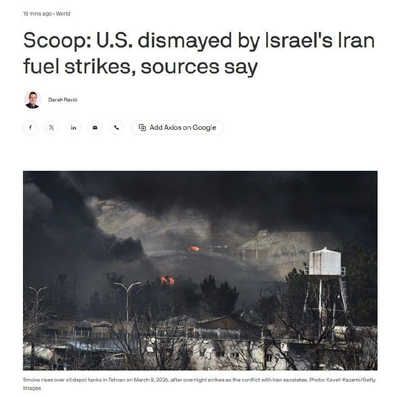 По словам источников портала, Вашингтон знал об атаках, но не ожидал такого масштаба. ЦАХАЛ ударил "по 30 иранским хранилищам топлива" в субботу. Белый дом опасается, что это может сплотить общество исламской республики, укрепить поддержку властей в Тегеране и вызвать повышение стоимости нефти. @BlizhniiVostok | #БлижнийВосток