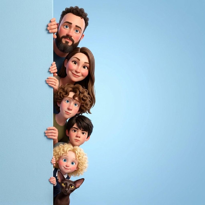 Промт, меняйте количество детей, людей и животных на свой лад. Каждая новая генерация не похожа на предыдущую Создайте качественную 3D-стилизованную мультяшную иллюстрацию по загруженным эталонным фото: мужчина, женщина и два старших сына и дочь и кот. Всего пять людей и кот выглядывают из-за вертикальной матовой стены слева; фото расположены в том же порядке что и итоговый результат видимы только головы, руки и верхняя часть торса, персонажи расположены вертикально друг под другом, как будто прячутся и игриво выглядывают. Композиция: мягкая фактурная пастельно-небесно-голубая стена на переднем плане слева и гладкий студийный градиентный фон в небесно-голубом тоне справа. Стиль должен быть мягким, анимированным, премиальным, в духе Pixar / Disney-style, с большими выразительными глазами, гладкой безупречной кожей, тонким румянцем и слегка увеличенными пропорциями головы для очаровательного кинематографичного эффекта. Очень важно: не менять черты лица ни у одного человека, максимально