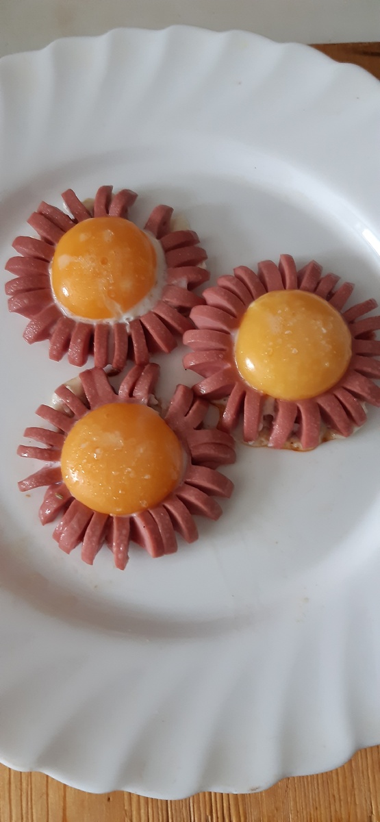 Всех приветствую на канале! Сегодня на завтрак жареные куриные яйца с сосиской. Эту технологию я подсмотрел примерно 2000-х в одном из ресторанов. Всё очень просто. Инструмент: Нож и китайские палочки. Можно использовать деревянные шпажки. Можно и обычные карандаши. Размещаем сосиску вот так: Палочки выполняют роль ограничителей разреза. Режу ножом сосиску. Шаг разреза - примерно 5 миллиметров. Вот так: Переворачиваю сосиску на 180 градусов. И режу её на две части, вдоль. Удаляю закруглённые концы и собираю конструкцию. Так: Фиксирую конструкцию зубочистками и размещаю на сковороде. С помощью ложки аккуратно размещаю яйцо в центре. И жарю. В итоге яйцо зафиксирует сосиску и зубочистку я вытащу. Результат: Очень хорошо подходит для бутербродов. На этом всё. С уважением, "Злобный колбасник" ТМ.