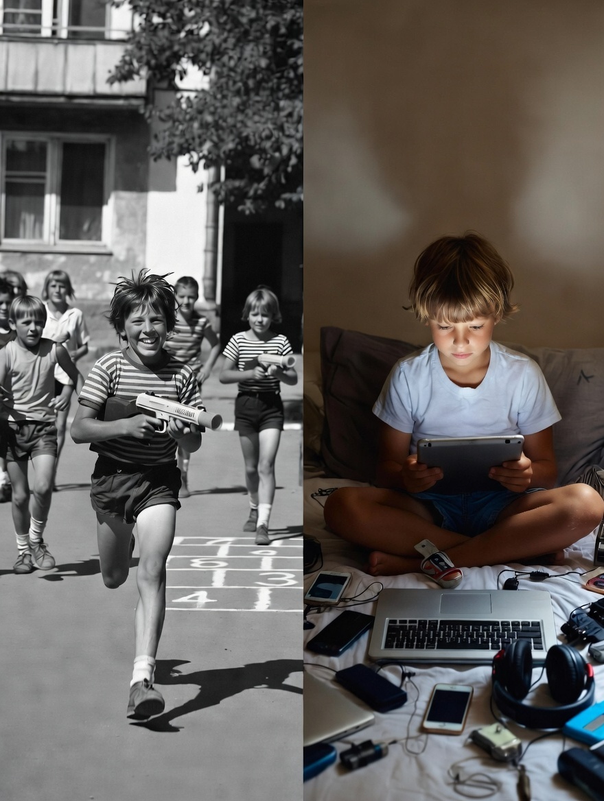 Сначала я решил покопаться в интернете – ведь в наше время все знания под рукой. Зашел на Яндекс, ввел "детство в СССР 1970-е сравнение с современностью". Выпало куча статей! Например, на сайте csruso.ru автор пишет, что советские дети радовались одной игрушке, как чуду, а сегодня у малышей "мешки" игрушек, и они быстро надоедают. Вспомнил свое: у меня был один плюшевый заяц, и я с ним спал годами, пока не истрепался. А мой внук? У него три машинки в год, и он их даже не замечает. На m24.ru вспоминают, как мы носили ключ на шее, гуляли до вечера, играли в "резиночку" и "классики". Двор был нашим миром – футбол, казаки-разбойники, первые влюбленности. Сегодня дети на улице? Редко, только дошкольники, а старшие в телефонах. Еще одна статья на maxim-nm.livejournal.com разоблачает мифы, но даже там признают: дети были на улице часами, без гаджетов, и это развивало самостоятельность. В форумах на VK и LiveJournal пожилые люди пишут: "Мы были бедняками материально, но богатыми душой – радость от простоты". Один пост: "В 70-е мы ездили на машинах без ремней, краски в кроватках с свинцом, но выжили и были счастливы". Интернет подтверждает: отсутствие избытка делало каждую вещь ценной, а общение – настоящим.