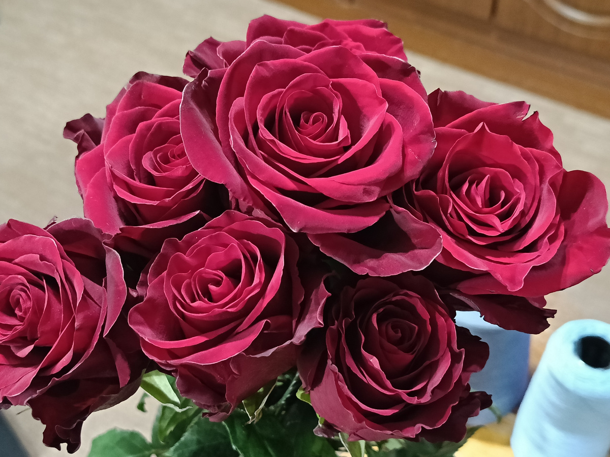Уже показывала цветы, которые подарил муж, очень красивые розы, сегодня пофоткала их при разном освещении, всё равно не удаётся поймать их настоящий цвет, такой тёмно бордовый , насыщенный .