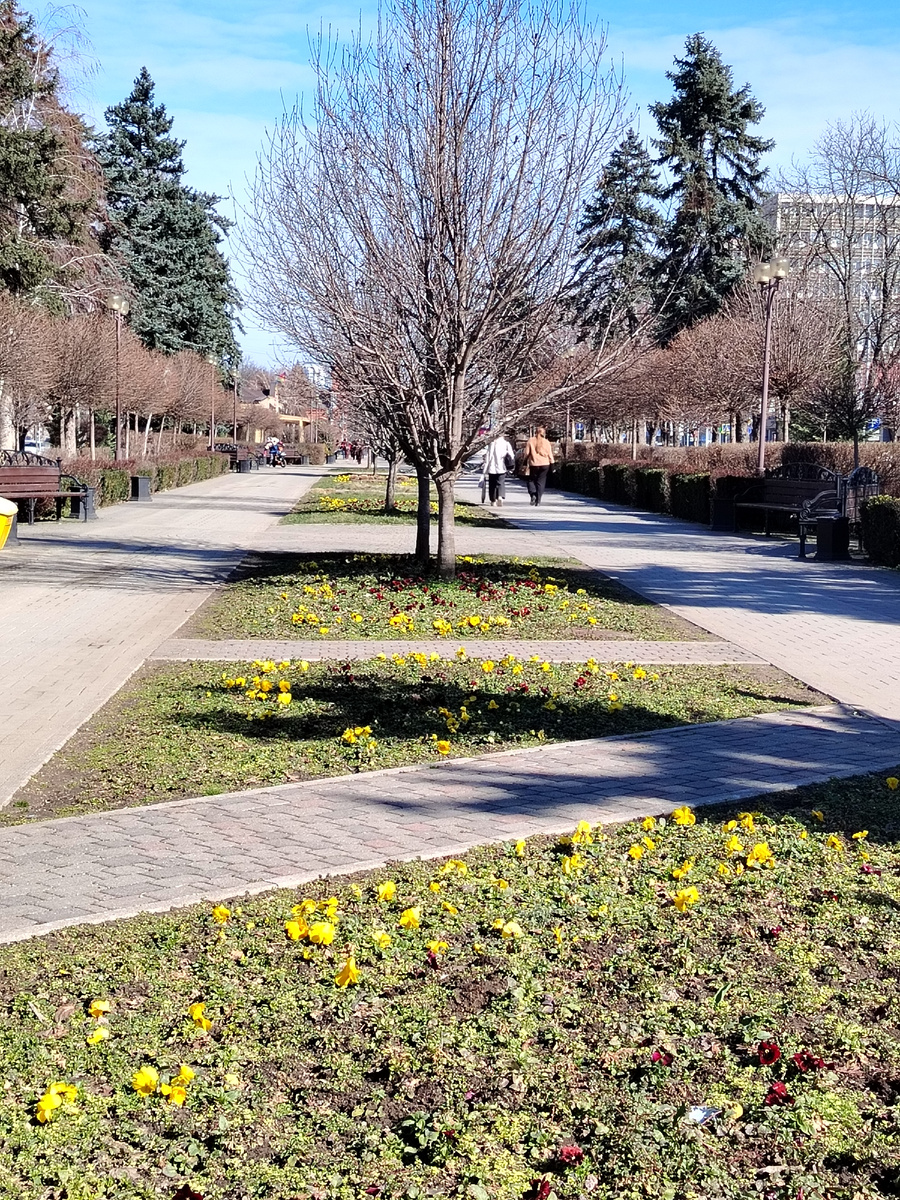Везде чисто, но серо, пока не распустятся деревья и кустарники, и не высадят цветы.