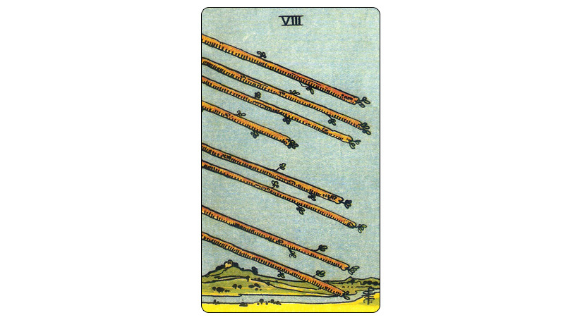 Цель близка! Еще чуть-чуть, и она будет достигнута. События развиваются быстро. Вот это основные значения Восьмерки Жезлов. Но важно, конечно, учитывать и сочетания Восьмерки Жезлов с другими картами в раскладе. Вот такие примеры мы далее разберем, а пока посмотрим на саму карту. Что изображено на ней? Стремительно летящие копья (стрелы). Причем, судя по траектории, они уже на подлете и готовы поразить цель. Это означает, что дело, о котором задает вопрос спрашивающий, развивается быстро (как полет стрелы) и уже на финишной прямой. Еще чуть-чуть, и цель будет достигнута. 1) Быстрое развитие событий 2) Отсутствие помех 3) Близость цели Это для прямого положения аркана основные значения. Как толковать перевернутые карты, и стоит ли вообще учитывать перевернутые положения Таро, читайте здесь >>> И следует заметить, что на карте изображены копья-стрелы на подлете, но мы не видим поражения цели. Выпуская стрелы, можно же прицелиться неправильно, и тогда они улетят мимо. Неизвестно, попадут