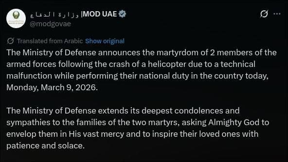 Минобороны ОАЭ сообщает, что 9 марта был "при выполнении долга" потерян "по техническим причинам" вертолет