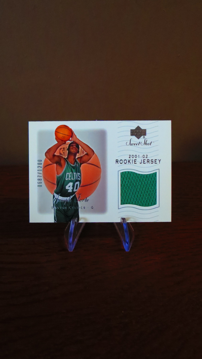 На изображении представлена коллекционная карточка из серии Upper Deck «Sweet Shot» (2001–02), посвящённая баскетболисту Джозефу Форте (Joseph Forte), выступавшему за команду «Бостон Селтикс» (Boston Celtics).