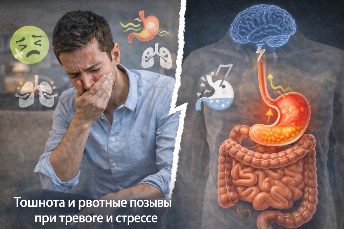 Тошнота на фоне тревоги часто пугает сильнее, чем сама тревога. Человек думает: “со мной что то серьёзное”, “я сейчас вырву”, “я потеряю контроль”, дальше запускается круг, страх усиливает симптомы, симптомы усиливают страх. Когда мозг считывает угрозу, включается режим “бей, беги или замри”, это реальная психофизиология. Активируется симпатика СНС, меняется гормональный фон, перераспределяется кровь, мышцы напрягаются, дыхание учащается, в пищеварении на фоне этого начнается спазмирование. Что происходит? 1. Тормозится нормальная работа желудка. Перистальтика становится неритмичной, желудок хуже “проталкивает” пищу дальше, появляется ощущение кома, тяжести, тошноты. у кого то наоборот ускоряется кишечник, отсюда спазмы и рвотные позывы и часто хочется в туалет. 2. Спазм диафрагмы и мышц живота. При тревоге человек часто дышит верхом груди и держит напряжение в животе. Диафрагма с из-за этого становится жесткой, дискомфорт, на этом фоне легко появляются рвотные позывы, особенно если е