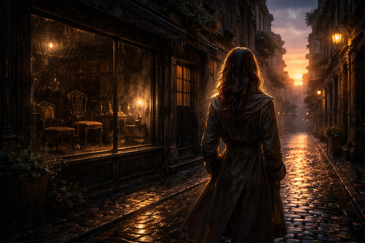 Она обернулась. На том месте, где горело окно «Ателье вероятностей», теперь была тёмная витрина какого-то антикварного магазина, заставленная пыльными стульями. Вывеска исчезла. Будто и не было ничего.