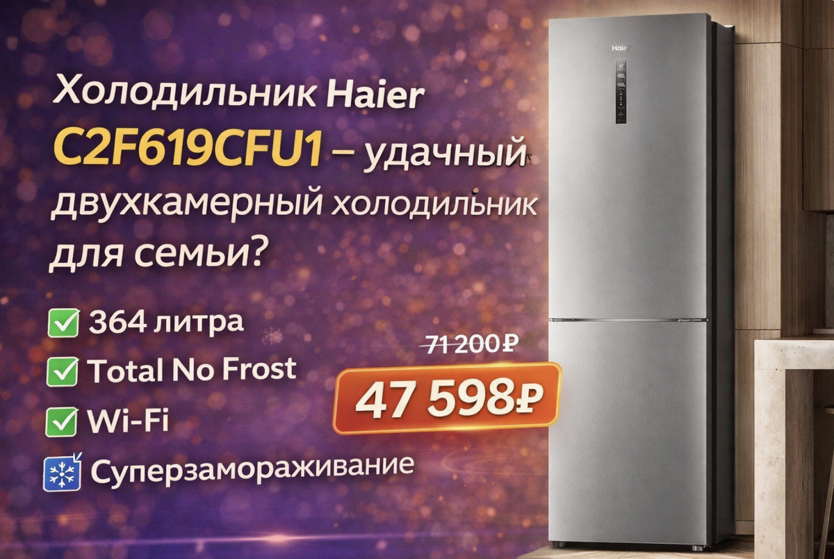 На этом фоне Haier C2F619CFU1 выглядит очень интересно. Это двухкамерный холодильник 364 литра с Total No Frost, Wi-Fi и современным набором функций, который подходит для квартиры и кухни на каждый день.