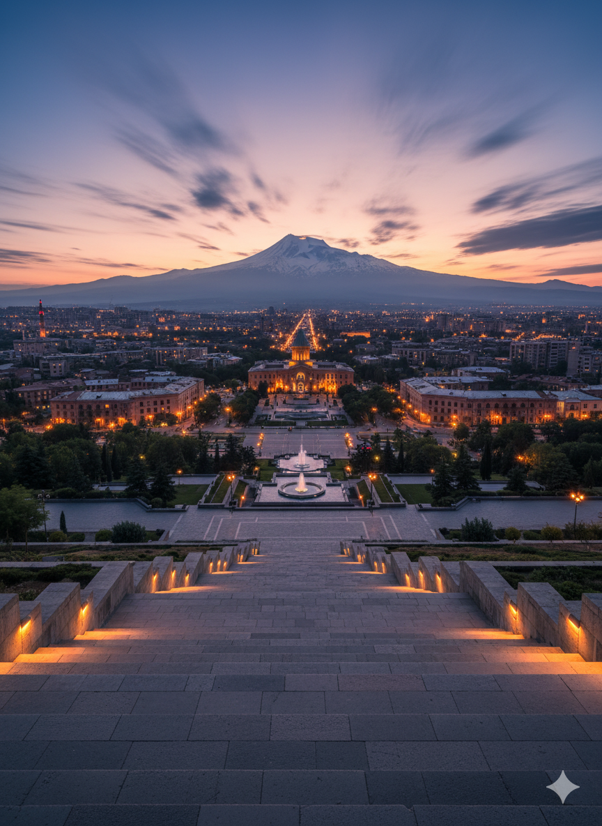 Каскад — самая узнаваемая достопримечательность Еревана: гигантская ступенчатая лестница в центре города, по которой можно подняться прямо к небу и увидеть весь Ереван на фоне горы Арарат. Это одновременно монументальная архитектура, открытая галерея современного искусства и лучшая смотровая площадка столицы.