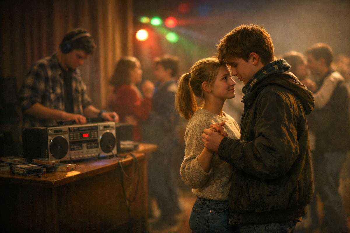 В какой-то момент музыка оборвалась, и в зале стало слышно сразу всё: скрип обуви по полу, чьи-то смешки, громкий вдох. Славка что-то провернул на магнитофоне, щёлкнуло — и полилась другая мелодия. Медленная. Мягкая. Такая, от которой сердце почему-то сразу начинает стучать чаще.