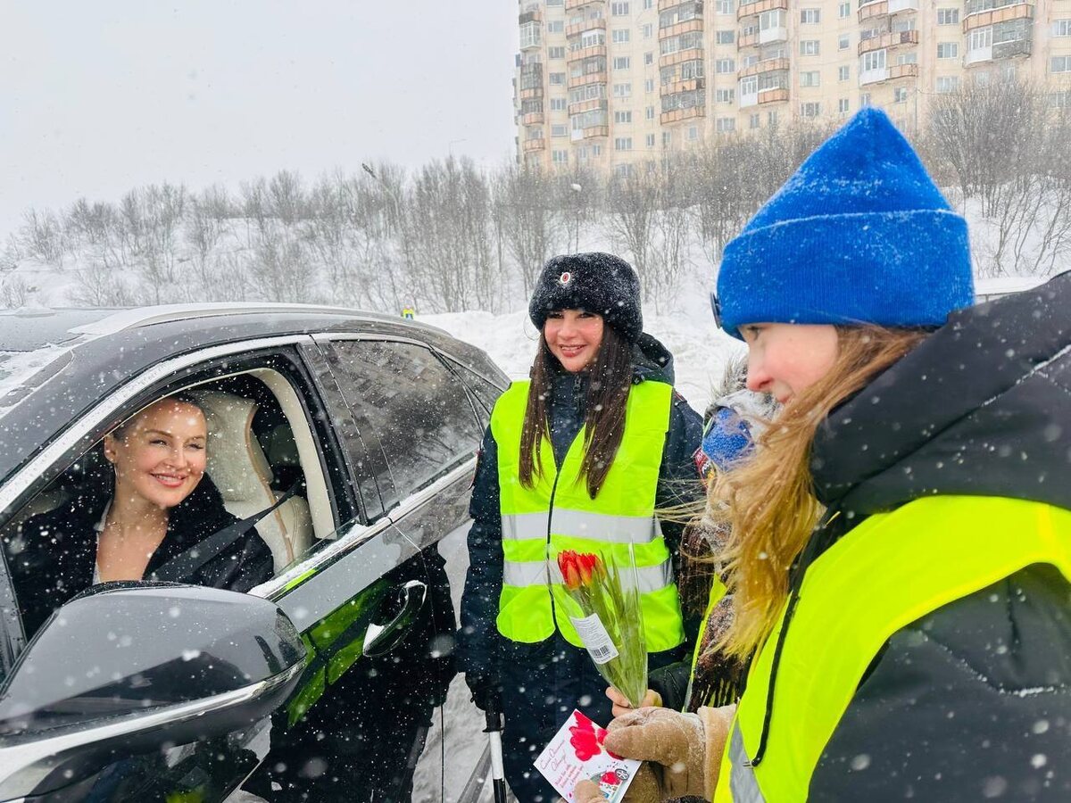 » В Госавтоинспекции Мурманской области сообщают, что 8 Марта сотрудники Госавтоинспекции Мурманской области в разных муниципалитетах региона уже по традиции поздравили прекрасную половину нашего региона с Международным женским днем во время акции «Цветы для автоледи». Не первый год в любую погоду инспекторы выходят на улицу с охапками цветов, чтобы подарить их женщинам за рулем, поздравить с праздником и подарить улыбки и хорошее настроение. Фото: Госавтоинспекция Мурманской области.