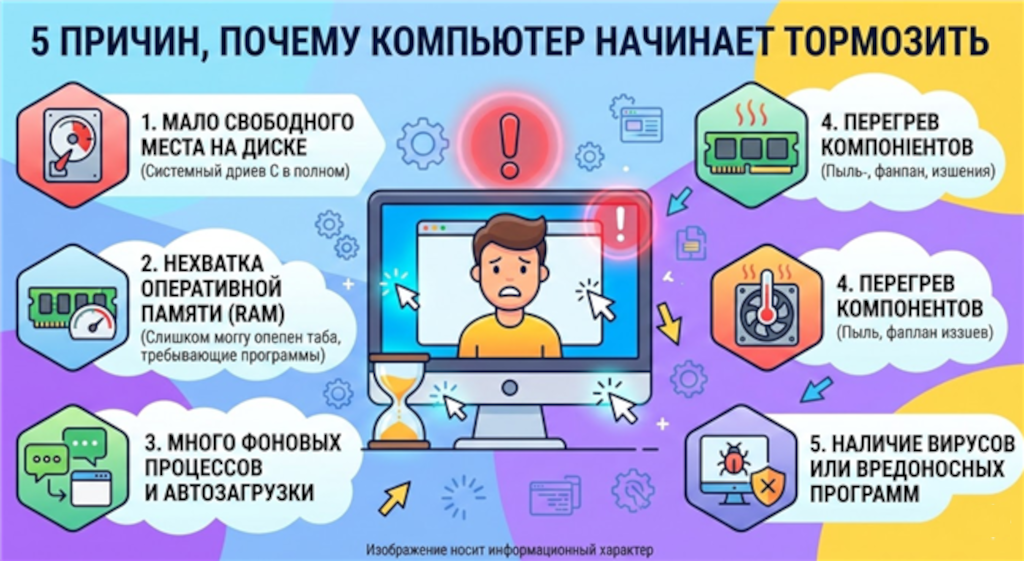 Многие пользователи сталкиваются с ситуацией, когда компьютер, который раньше работал быстро, со временем начинает медленно запускаться, зависать и долго открывать программы. Это может происходить даже на достаточно мощных устройствах. Чаще всего проблема связана не с поломкой оборудования, а с обычными причинами, которые можно устранить самостоятельно. Рассмотрим 5 распространённых причин, почему компьютер начинает тормозить, и что можно сделать в такой ситуации. Одна из самых частых причин медленной работы — большое количество программ, которые запускаются вместе с системой. После установки различных приложений многие из них автоматически добавляются в автозагрузку. В результате при включении компьютера одновременно запускаются десятки процессов. Это приводит к: Проверить список автозагрузки можно через диспетчер задач в Microsoft Windows и отключить ненужные программы. Если системный диск почти заполнен, Windows начинает работать значительно медленнее. Система использует свободное п