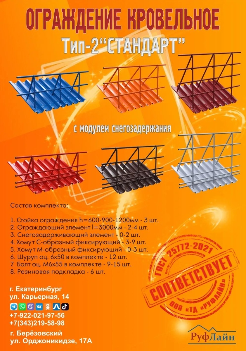 ": • высота 600, 900, 1200мм, • опционально модуль снегозадержания, • изготовление под любой угол наклона кровли, • адаптеры для монтажа на профлист и сэндвич, • изменение конструкции под индивидуальные потребности, • любой цвет каталога RAL. Данный тип ограждения отличают: • значительная надежность, благодаря применению в конструкции опорных стоек, изготовленных из стальной профильной трубы 20х20мм, • простота монтажа на объекте, • эстетичный внешний вид. ООО "ТД"РУФЛАЙН" - забота о Вашей безопасности! Tel - Telegram - Max +7(343)207-65-68 +7(922)021-97-56 pm3@uralroof.ru http://руфлайн66.рф https://max.ru/id6685089174_biz https://max.ru/id6685089174_bot https://t.me/td_roofline https://dzen.ru/id/6238c4888f56b3749c570a09 https://t.me/roofsalebot/app