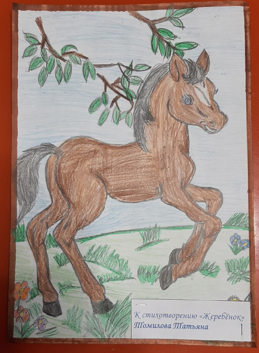 Описание: Рисунок выполнен цветными карандашами к стихотворению Н. Рубцова «Жеребёнок». Девочку впечатлило стихотворение и предистория, которая связана с воспоминанием поэта о случае из детдомовской жизни, когда он и другие подростки играли с жеребенком Бурчиком и ухаживали за ним. Поэтому она постаралась, чтобы жеребёнок получился «милым, забавным и очень добрым…» (со слов девочки). #Рубцов90 #ЦентрТендрякова #Тендряковка #ЮЦ #МояРодинаМилая