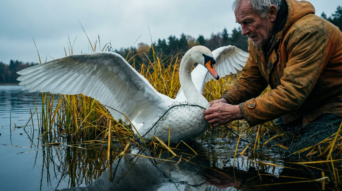 Лебедь. Крупный самец, белое оперение ярко выделялось на фоне тёмной воды. Мощные крылья, длинная изогнутая шея, чёрный клюв с оранжевым основанием. Красивая, сильная птица. Но сейчас он был в ловушке.