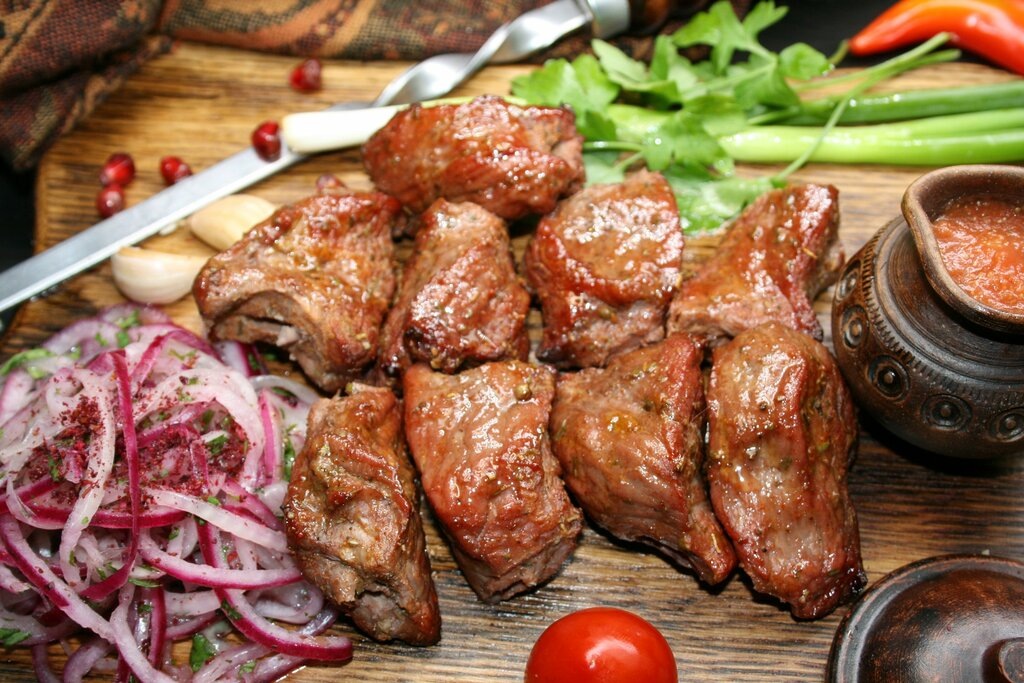 1) Удалить с мяса сухожилия и жир, нарезать кубиками по 4 см. Для маринада очистить луковицы и чеснок, мелко порубить, смешать с лимонным соком и оливковым маслом. Добавить тимьян, молотую паприку, стручок острого красного перца, тмин и пряные травы. Этой смесью обмазать мясо, накрыть крышкой и оставить мариноваться минимум на 4 часа.