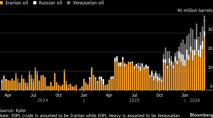 Это на 17% больше, чем за неделю до начала иранской войны, подсчитал Kpler. Нефть, скопившаяся на танкерах близ побережья Китая (оранжевым — иранская, белым — российская, серым — венесуэльская) в млн баррелей. Данные: Kpler, источник: Bloomberg Рекордный объём так называемой подсанкционной нефти скопился на танкерах неподалеку от побережья Китая. Эти запасы представляют собой потенциальную подушку безопасности для частных нефтеперерабатывающих заводов страны на фоне продолжающейся войны на Ближнем Востоке, которая повлекла за собой перебои с поставками сырья из стран Персидского Залива. Почти 40 млн баррелей нефти из Ирана, России и Венесуэлы находятся близ побережья Китая. Это на 17% с лишним больше, чем за неделю до начала иранской войны, подсчитал Kpler. Около двух третей этого объёма находится на танкерах, вставших на якорь в Жёлтом море, а остальное — в Южно-Китайском море. Конфликт на Ближнем Востоке ураганом пронёсся по мировому рынку нефти. Вследствие этого события цены подскоч