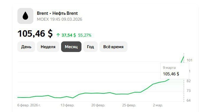 Brent уже выше 100 долларов и за месяц рост больше чем на 50 процентов. Для нефтяного рынка это почти вертикальный взлёт. И тут начинается геополитическая ирония. США начинают бить по Ирану, рынок закладывает риск перекрытия Ормузского пролива, нефть улетает вверх, а основные бенефициары этой цены оказываются Россия и страны залива. Неудивительно, что в интернете уже шутят, что Трамп на самом деле российский агент. И если смотреть только на график нефти, версия выглядит подозрительно убедительно. 😏 Брекотин. Подписаться 🇷🇺 Брекотин в MAX