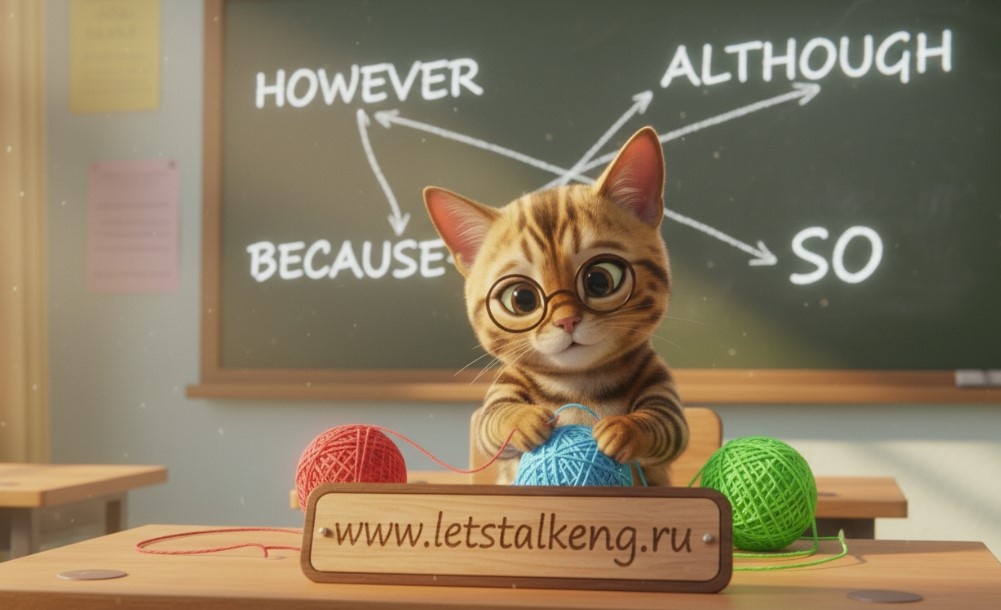 Мяу, мои дорогие студенты! С вами снова Фаня, ваша пушистая помощница и самая умная бенгальская кошечка-репетитор. Готовы сделать свой английский по-настоящему красивым?Когда мы только начинаем учить язык, мы говорим короткими фразами: “Я люблю рыбку. Рыбка вкусная.” Но сегодня мы научимся связывать наши мысли в длинные, элегантные предложения с помощью специальных слов-связок (Connectors). Это как связывать разноцветные клубочки пряжи в один красивый узор!Обещаю, будет paws-itively (мур-р-рчаще) интересно! Учить английский спокойно, с уважением к своему ритму жизни — это реально. Я приглашаю на онлайн-уроки, где всё внимание уделяется исключительно вам и вашим целям. Узнать подробности и записаться на занятие можно на моей странице: Обо мне | Цены Иногда нам нужно показать, что две идеи спорят друг с другом. В русском мы говорим “но” или “хотя”. В английском для этого есть два главных слова. 1. However (Однако, тем не менее) Слово However очень строгое и независимое, как кот, который