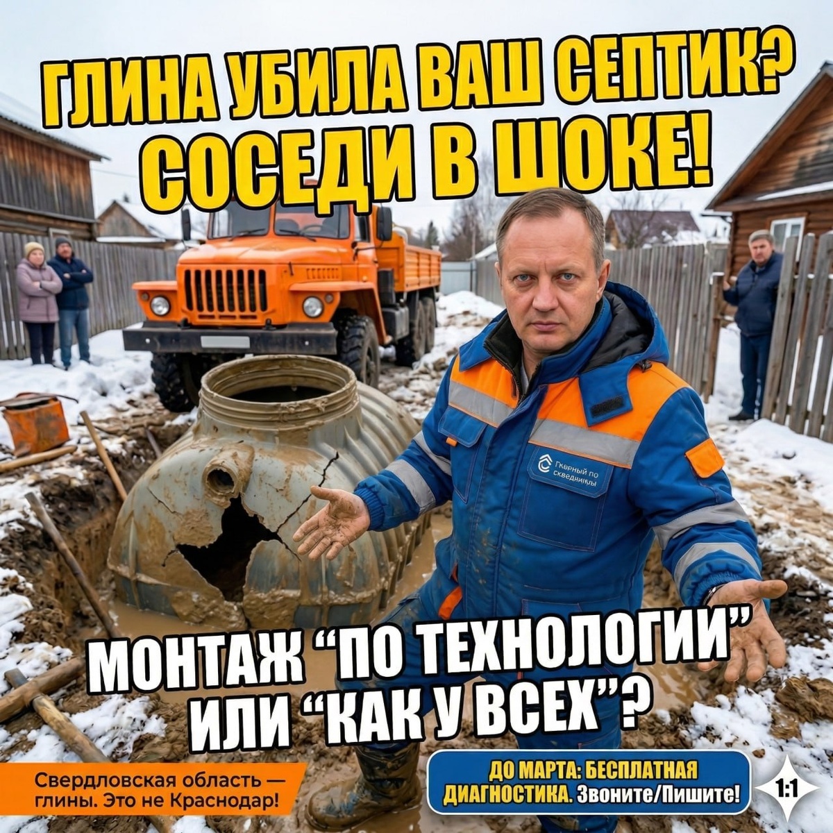 ₽. Первая весна — и запах по всему участку. Монтажники говорят: «Это не к нам, это грунт у вас такой». Производитель говорит: «Это монтаж неправильный». А вы стоите посередине — с запахом и без виноватых. 💣 Переделка септика в Свердловской области — 150–200 тыс ₽. Это демонтаж. Новый котлован. Новая засыпка. Иногда — новый септик, потому что старый треснул. Плюс то, что не считается деньгами: — лето без нормального двора — стыд перед соседями — постоянная тревога: «А вдруг весной снова?» И самое горькое: этого можно было избежать. Один правильный монтаж — и вы бы про септик вообще не вспоминали. 💸 🔍 Три причины, по которым септик воняет уже первой весной В Свердловской области почти везде — глины, суглинки, пучинистые грунты. Это не Краснодар и не Подмосковье с песчаными почвами. Здесь своя физика. И здесь свои ошибки. ❌ Причина №1: Засыпали грунтом из ямы Выкопали котлован — вытащили глину с камнями. Поставили септик — закопали той же глиной обратно. Глина набирает воду. З