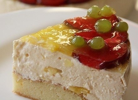 Нужное количество подготовленного желатина ввести в апельсиновый сок, смазать творожную поверхность апельсиновым соком и выложить подготовленные фрукты. Фрукты смазать застывающим апельсиновым соком.