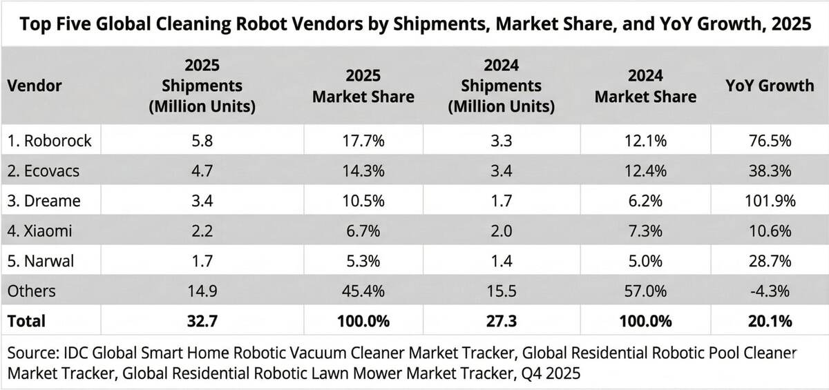 - Рынок роботизированных уборщиков вырос на 20.1% в 2025 году, достигнув 32.72 млн проданных единиц
