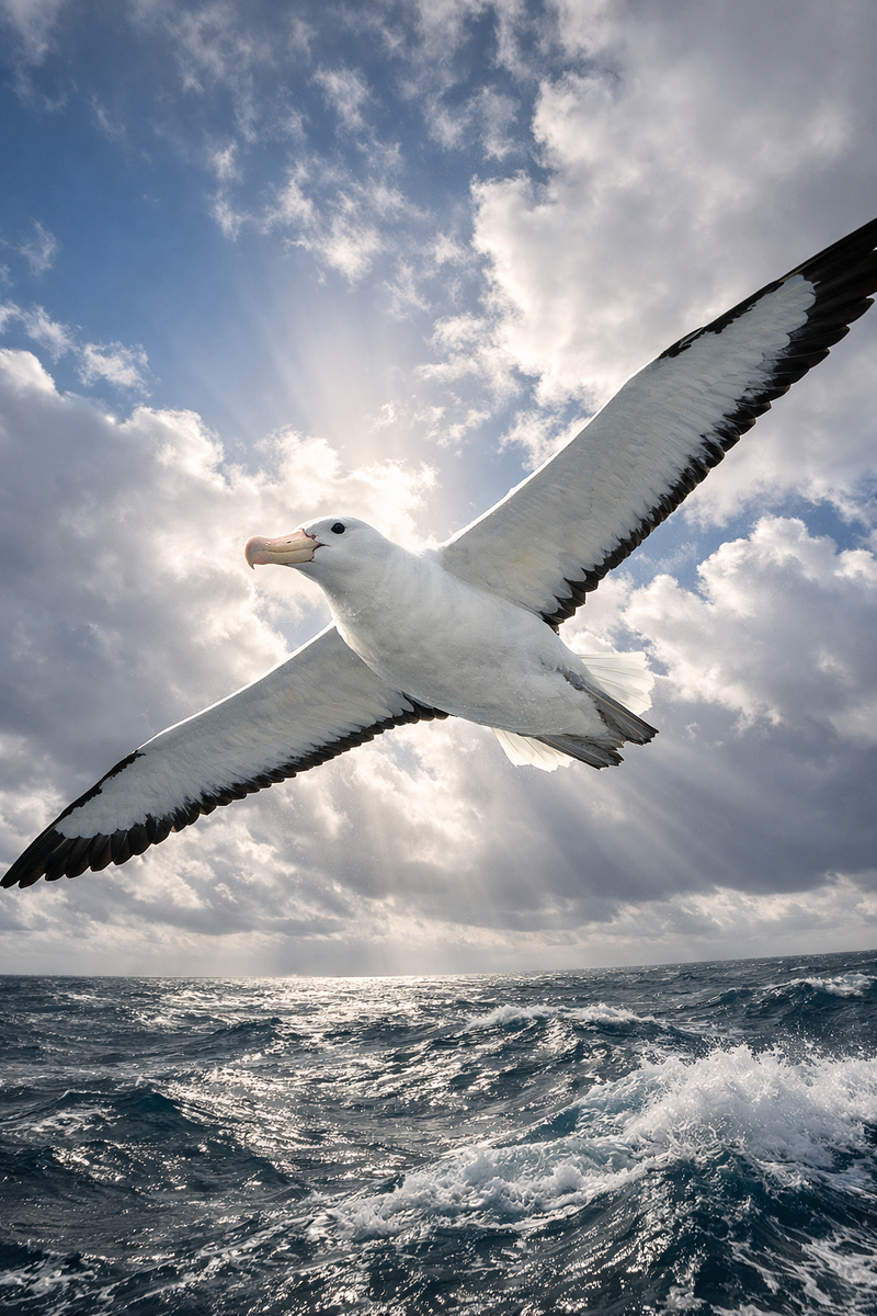 Факт: Альбатрос может парить часами, не взмахивая крыльями ни разу. Энергии тратится минимум, а скорость достигает 100–120 км/ч.