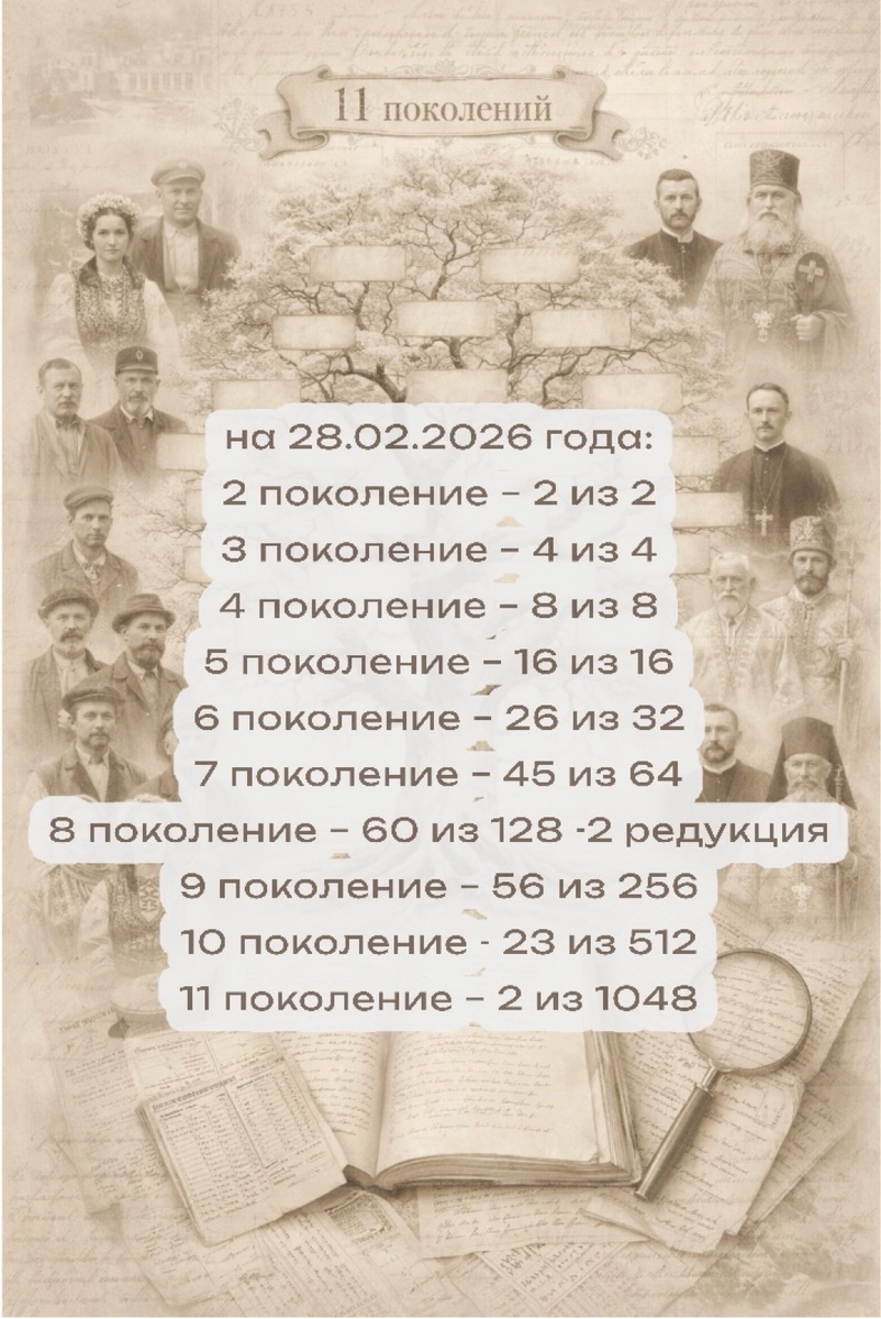 Всем привет. Давно я не выкладывала новые данные по моим найденным предкам. Фамилии в родах: У мамы – крестьяне и лесничие - Варченко, Музыка(Музыченко), Палий, Бабак, Быховець, Чухманенко (Чухман), Забредний, Ночовненко, Бондаренко, Крыса, Духота, Шикин, Хилько, Витряный (Бура, Буря), Макуха, Мазниченко, (Скотаренко, ранее Скотарь, еще ранее Мирочник), Кириенко, Дзусенко, Гракун, Старенький, Кононенко. По географии – Старые Петровцы, Лютеж, Вышгород, Подгорцы, Кренычи – Киевский уезд. У папы – крестьяне – Сыч, Носач, Кондратенко (Кондратюк), Черномор, Полищук, Сущенко (ранее Сушко), Власюк, Гонтарук, Шинкаренко, Гаращук, Кислюк. По географии – Остров, Фастовка - Васильковский уезд, Березна, Гайворон – Сквирский уезд. У папы – священнослужители – Пейзанский (ранее Пайзанский), Коломацкий, Лебединцев, Ильяшевич, Вакуловский, Высоцкий, Ольшевский, Сикорский, Выражевич, Чекавский, Погорецкий. По географии – Киевский, Чигиринский, Звенигородский, Черкасский, Каневский, Бердичевский, Тараща