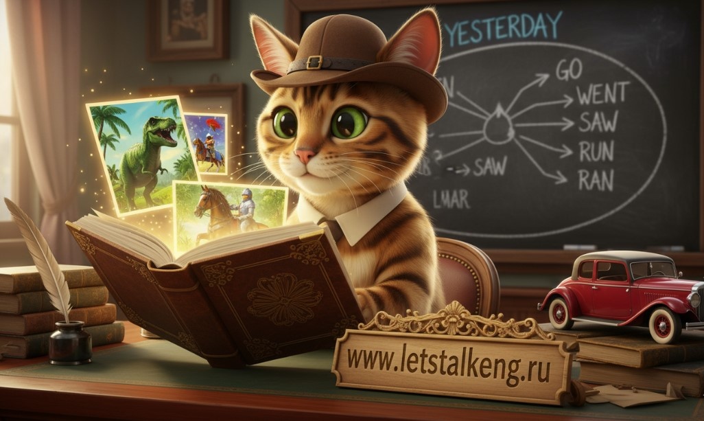Мяу, мои дорогие ученики! С вами снова Фаня, ваша пушистая помощница и самая умная бенгальская кошечка-репетитор. Готовы отправиться в путешествие во времени? Сегодня мы заглянем в наше прошлое и научимся о нем рассказывать!Мы разберем самое важное и самое частое время в английском языке — Past Simple (Простое прошедшее). Оно помогает нам делиться воспоминаниями, рассказывать истории и говорить обо всем, что уже случилось. Обещаю, это будет paws-itively (мур-р-рчаще) увлекательно! Учить английский спокойно, с уважением к своему ритму жизни — это реально. Я приглашаю на онлайн-уроки, где всё внимание уделяется исключительно вам и вашим целям. Узнать подробности и записаться на занятие можно на моей странице: Обо мне | Цены Чтобы “перенести” глагол в прошлое, у нас есть два пути. 1. Правильные глаголы (Regular Verbs) Это послушные “котята” нашей грамматики. Они просто добавляют к себе хвостик -ed. 2. Неправильные глаголы (Irregular Verbs) А это настоящие “динозавры” — их нужно просто зап