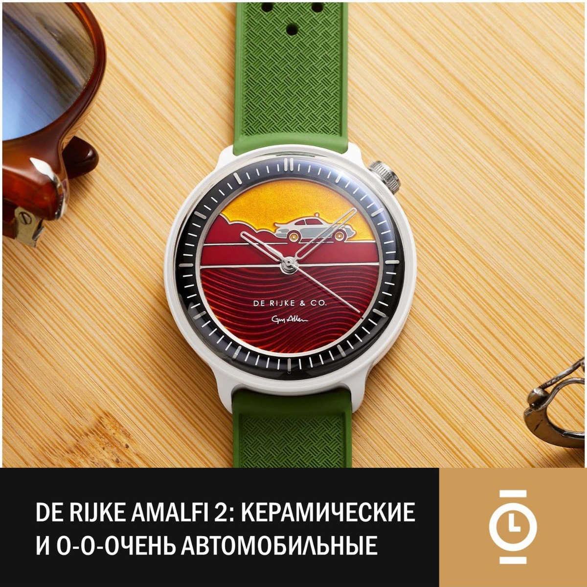 AMALFI SERIES 2: КЕРАМИЧЕСКИЕ И О-О-ОЧЕНЬ АВТОМОБИЛЬНЫЕ #обзор_wd Голландец Лауренс де Рейке (Laurens De Rijke читается именно так) любил и любит всё, что ездит. Однажды он на мотороллере Vespa махнул через Евразию до Монголии – примерно на 8 000 км. На рынке в Тбилиси ему понравились советские часы «Восток» – так он полюбил ещё и часы. Теперь он соединяет две страсти: делает необычные авточасы. Их фишка – поворотный корпус: можно оставить в классическом положении или довернуть на 90° вправо – чтобы время читалось, когда рука на руле. Два года назад вышла серия Amalfi 1 с титановым корпусом и эмалевыми миниатюрами. Теперь – Amalfi 2. Главное новшество – полностью керамический корпус того же размера (38,2 х 11 мм, WR50) и с той же возможностью поворота на 90°. Внутри него простой, скучный и надёжный автомат Sellita SW300 (28 800 пк/ч, запас хода 42 часа). Вторая новинка – новый эмалевый циферблат. Британский автоиллюстратор Гай Алленом создал миниатюры трёх культовых автомобилей: 🟢