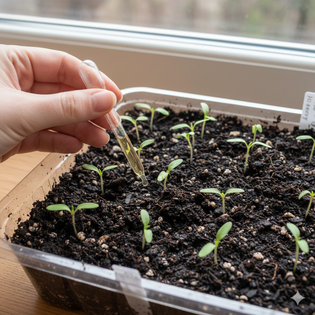 Янтарная кислота — природный стимулятор роста и адаптоген. Она помогает рассаде быстрее наращивать корни, легче переносить пикировку и другие стрессы. Раствор готовят из расчета 1 таблетка на 1 литр теплой воды. Можно поливать под корень или опрыскивать листья.