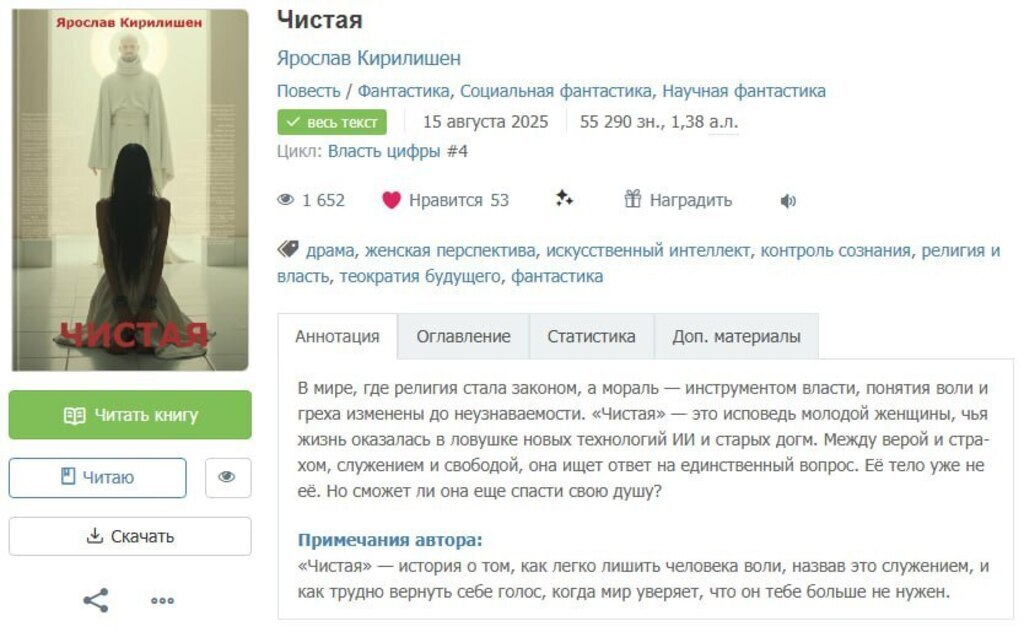 Жанры: Социальная фантастика, Научная фантастика, киберпанк (по моему мнению) Читать на Author.Today: https://author.today/work/479303 Изумительной красоты социально-фантастическая повесть о воле и вере. Цитата: