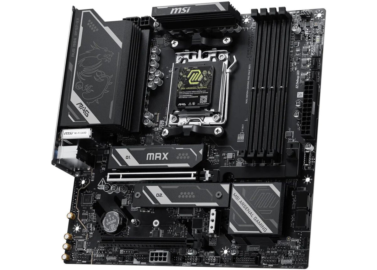 Компания MSI представила материнскую плату MAG B850M GAMING PRO MAX WIFI для процессоров AMD AM5, сообщает Wccftech. Хотя эта плата позиционируется как решение средне-начального класса, брендинг OC Engine указывает на возможность разгона системной шины BCLK за счёт наличия внешнего тактового генератора. Также плата оснащается микросхемой UEFI BIOS с увеличенным объёмом памяти 64 МБ, что должно позволить добавить поддержку всех совместимых процессоров AMD Ryzen без необходимости освобождать место за счёт удаления поддержки устаревших моделей. Источник изображения: MSI (и далее) Материнская плата MSI MAG B850M GAMING PRO MAX WIFI выполнена в форм-факторе Micro-ATX и поддерживает все актуальные процессоры AMD AM5, включая новейшие модели серии Ryzen 9000. Плата оснащена четырьмя слотами DDR5 и поддерживает до 256 ГБ оперативной памяти. Максимальная скорость при разгоне двух одноранговых модулей может достигать 8200 мегатранзакций в секунду. Основной слот PCI-E поддерживает PCIe 5.0 от про