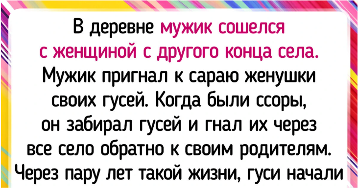 - Эту историю услышала от бабушки. В деревне мужик сошелся с женщиной с другого конца села. Жилья своего у «жениха» не было, он жил у родителей, а у «невесты» был дом. Решили жить там. Мужик пригнал к сараю женушки своих гусей. Когда были ссоры, он забирал гусей и гнал их через все село обратно к родителям. Через пару лет такой жизни, гуси уже слыша скандал в доме, собирались под калиткой и радостно гоготали, мол, ждать уже устали, готовы идти. А говорят, что глупые птицы.