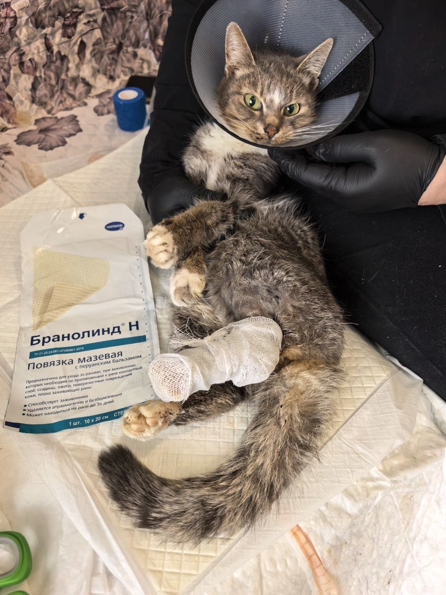 Помните кошечку, которую принесли паломники? Она еще заснула у нас в неестественной позе с задранной ногой? У этой кошки на лапке не просто царапина, а настоящая головоломка для нас с Сашей. С учетом длинных выходных мы решили забрать ее из клиники домой, чтобы внимательно следить за состоянием. Назвали ее конечно же Лапкой, а каждый день теперь у нас будет один и тот же ритуал для Лапки с лапкой: Как Лапка чувствует себя в новой обстановке? Она в полнейшем изумлении. Сидит с глазами по пол-лица, огромными и зеленющими, и, кажется, до сих пор пытается осознать, как она вообще здесь оказалась: «А кто-нибудь подскажет, что произошло? Где я? И почему лапа в бинтах?». Лапка настолько погружена в свои мысли, что даже миску с едой находит не сразу. Сегодня пришлось кормить её с рук. Почему-то в руках еда начинает обладать каким-то особым притяжением и сразу находится. Так вот погудит на нас с Сашей немного, потом искусает мне руки от голода, наестся и ложится спать. Сейчас она спит и даже