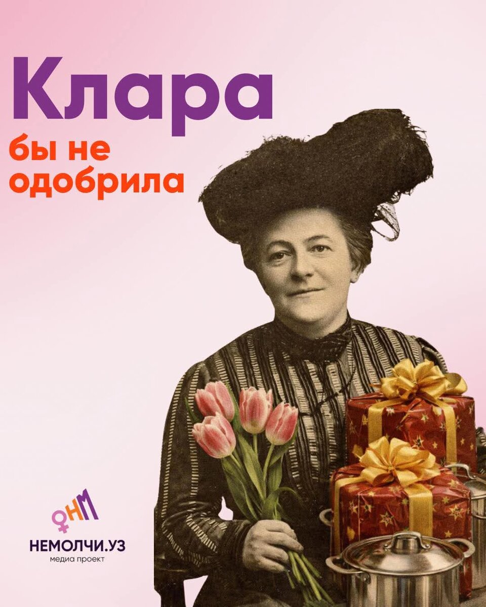 Поначалу в празднике 8 марта сохранялось хотя бы внешнее идеологическое содержание — плакаты с работницами, призывы к ликвидации неграмотности, что-то про освобождение от буржуазного гнёта. Но к пятидесятым годам праздник уже вполне устойчиво превращался в день весны, и женственности. Политические лозунги мельчали, мимоза дорожала, а риторика о правах незаметно сползала в риторику о том, что женщина — это нежность, хранительница очага и вообще лучше мужчины справляется с многозадачностью, что, конечно, само по себе комплимент небесспорный. То есть праздник приехал ровно туда, откуда Цеткин его пыталась увезти.