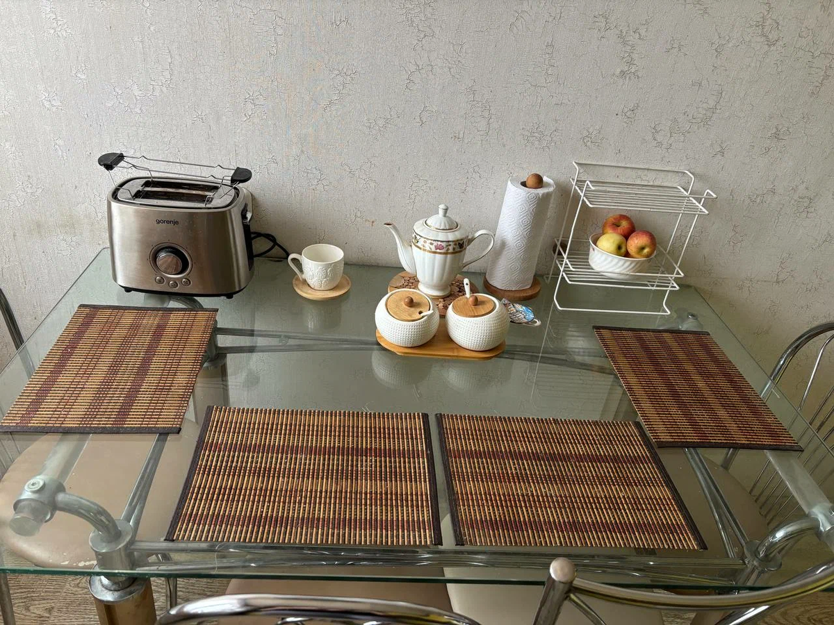- Соприкосновение с посудой и столовыми приборами вызывает звонкий скрежет. Пожалуй, этот минус для меня самый существенный — мне некомфортно завтракать и обедать под такой «аккомпанемент». Но вопрос решаемый — я купила плейсматы. Кстати, с ними на кухне даже уютнее.