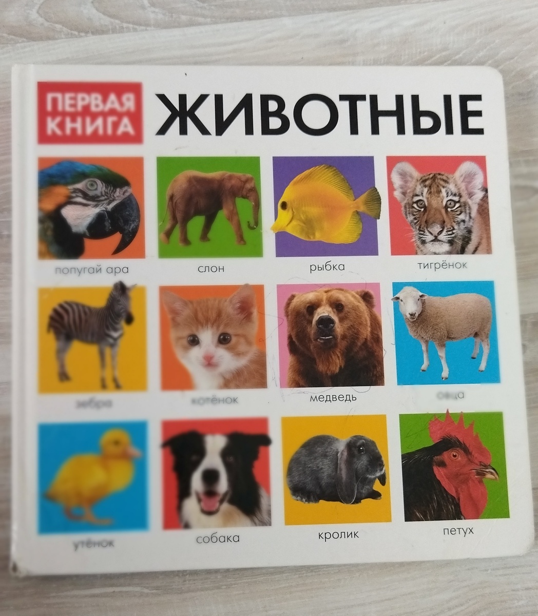 Яркие книжки-картинки с крупными изображениями животных или предметов. Яркие цвета привлекают внимание ребенка и стимулируют развитие зрения.