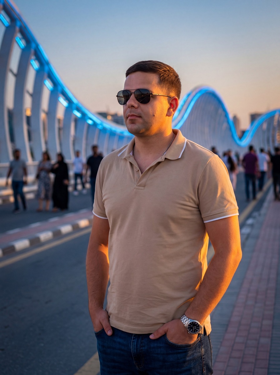 🤖Генерировать можно здесь: 👉БОТ ДЛЯ ГЕНЕРАЦИИ Режим Nano Banana 2/Pro ИНСТРУКЦИЯ Фотография молодого мужчины с загруженного фото.Черты лица, форма глаз, цвет волос и общий облик мужчины строго перенесены с загруженного референсного фото - точное сходство обязательно, в стильных солнцезащитных очках. Он одет в бежевую поло-рубашку с белой окантовкой на воротнике и рукавах, темные джинсы, на запястье — стильные часы. Мужчина стоит уверенно, руки в карманах, взгляд направлен в сторону, выражение лица спокойное и задумчивое. Фон — современная городская набережная или мост с синей неоновой подсветкой арочных конструкций, размытые силуэты прохожих на заднем плане. Съемка выполнена в «золотой час» — мягкий теплый свет заката создает контраст с холодным синим светом фона. Ракурс — средний план, камера на уровне глаз, глубина резкости малая (размытый фон), высокое качество изображения, стиль — модная уличная фотография с кинематографичным настроением, реалистичная детализация, естественные цв