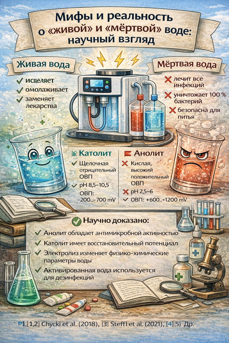 Термины «живая» и «мёртвая» вода широко распространены в популярной литературе и рекламе устройств для электроактивации воды. Часто им приписывают почти чудодейственные свойства — от омоложения организма до лечения хронических заболеваний. Научный подход требует рассмотреть, что стоит за этими названиями с точки зрения физико-химии и биологии. Эти названия возникли из бытовой терминологии для обозначения двух растворов, получаемых при электролизе воды: Народное названиеНаучное названиеОсновные свойства«Живая вода»КатолитЩелочная реакция, отрицательный ОВП«Мёртвая вода»АнолитКислая реакция, высокий положительный ОВП Типичные параметры: Он обладает восстановительными свойствами. Типичные параметры: Он обладает выраженными окислительными и антимикробными свойствами. Иногда утверждается, что католит способен: Процесс старения связан с: Хотя отрицательный окислительно-восстановительный потенциал воды иногда связывают с антиоксидантными свойствами, в организме существуют мощные системы антио