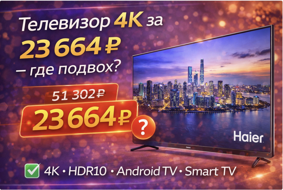 Когда видишь телевизор с 4K, HDR10 и Smart TV, автоматически ожидаешь цену заметно выше. Но в случае с Haier 43 LED H1 текущая стоимость 23 664 рубля выглядит очень интересно, особенно на фоне старой цены 51 302 рубля.