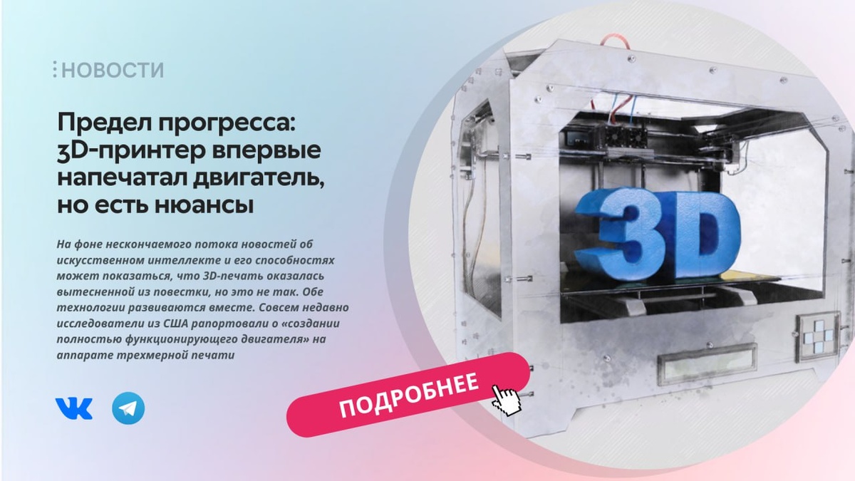 👇🏻 💥В начале нынешнего года ученые Массачусетского технологического института разработали новую платформу для 3D-печати, которая позволяет получить полностью функционирующий электродвигатель. Самое интересное, что процесс создания одной такой силовой установки занимает всего около трех часов. 💥Главное — принтер из Массачусетса способен работать с разными материалами, автоматически переключаясь и формируя конечное изделие шаг за шагом, слой за слоем. 💥Хорошо известно, что дьявол кроется в деталях, и в данном случае — в линейном характере силового агрегата. В отличие от традиционных электродвигателей, которые генерируют вращательное движение, линейные создают движение прямолинейное, а поэтому не подходят для оснащения ими транспортных средств. Конвейер, где как раз нужно прямолинейное перемещение без механических передач — пожалуйста. 💥Для тех же автозаводов такие линейные двигатели из 3D-принтера могут быть очень привлекательны потому, что при возникновении какой-то поломки по
