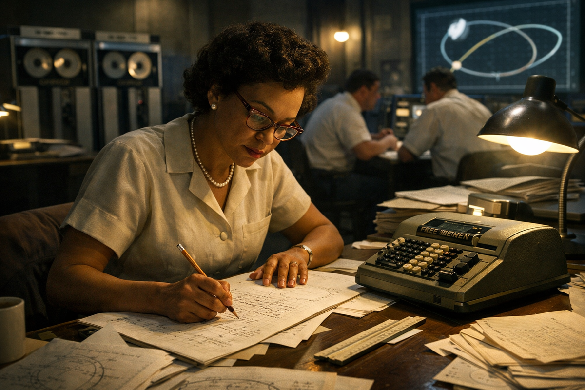 Кэтрин Джонсон сидела в расчётном центре вместе с командой и слушала переговоры по радио. На её столе лежал чистый блокнот — на случай, если понадобится считать в реальном времени. Не понадобился.