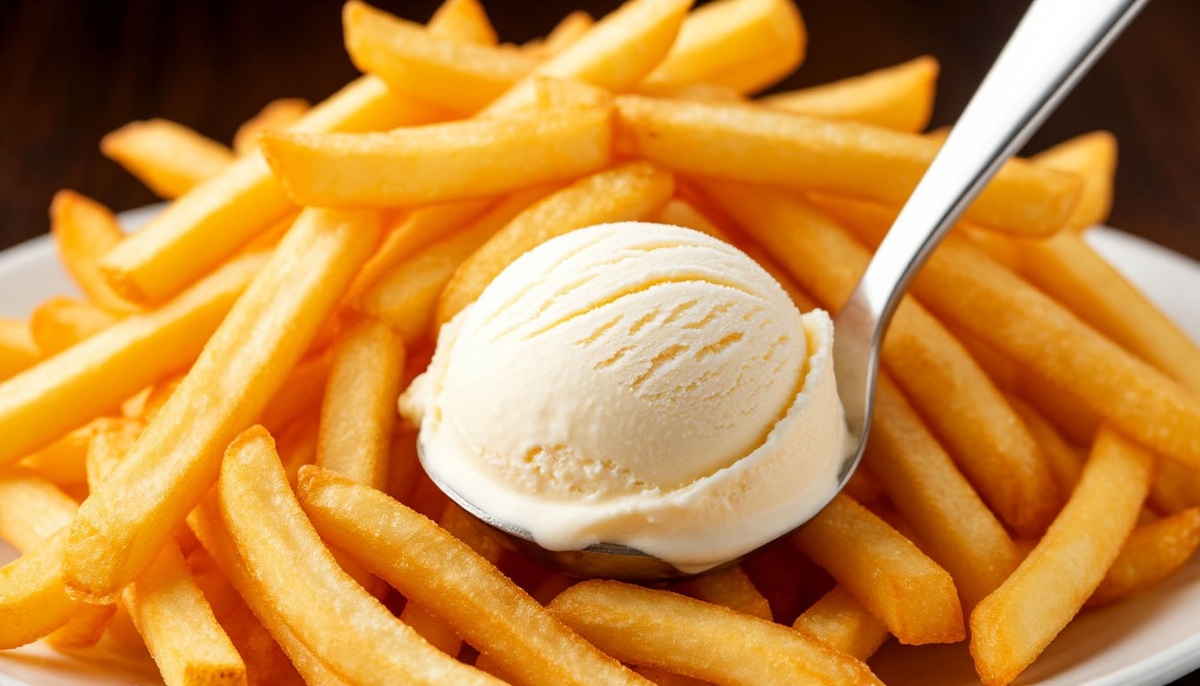 Берете хрустящую, соленную с маслом картошку и макаете в ванильный пломбир.